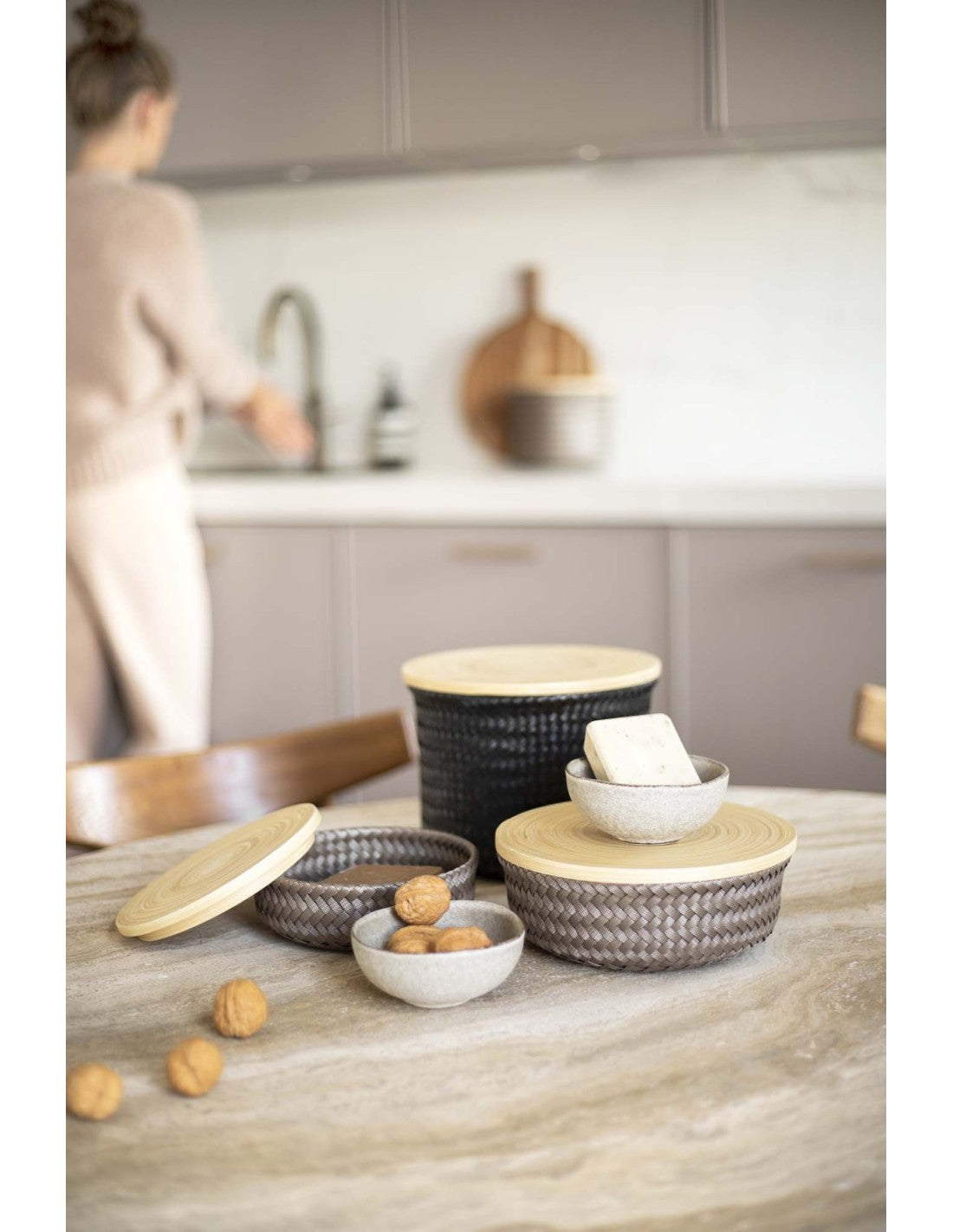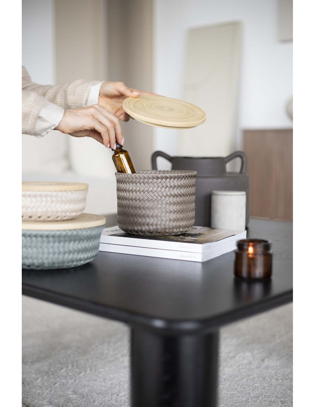 Der „Wonder XS High“ ist ein moderner Aufbewahrungskorb mit Deckel, der durch feine Details und ein einzigartiges Flechtmuster besticht. Er eignet sich perfekt zur stilvollen Aufbewahrung im Badezimmer oder für Stifte und Marker im Arbeitszimmer. Der Bambusdeckel sorgt dafür, dass alle Gegenstände ordentlich und diskret verstaut sind. Handgefertigt aus recyceltem Kunststoff, bietet dieser Korb eine nachhaltige und ästhetische Lösung.